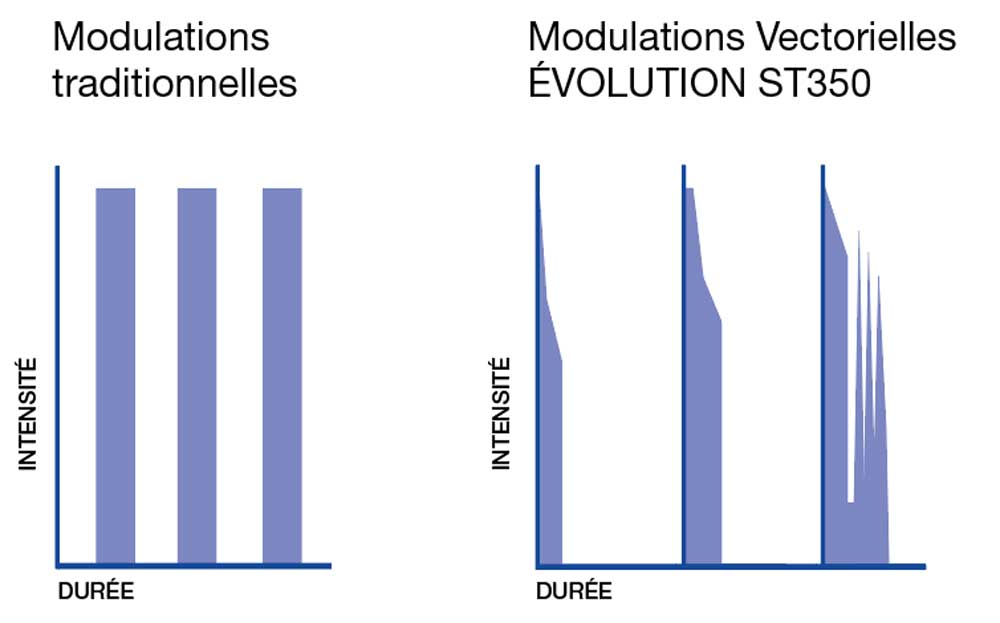 Contrairement aux appareils conventionnels qui transmettent un courant électrique constant et inconfortable, ÉVOLUTION ST350 améliore les résultats, concentre l’énergie et réduit l’inconfort grâce aux Modulations Vectorielles exclusives à Silhouet-Tone.