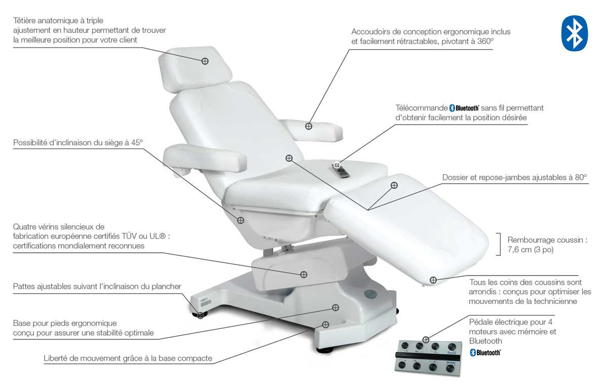 Grâce à ses quatre vérins silencieux et à sa mécanique bien équilibrée, il est possible de procéder à des réglages simultanés en douceur et en toute fluidité. Ce fauteuil de traitement à la fois luxueux et fonctionnel est pratique pour l’esthéticienne, mais aussi pour la personne qui reçoit le traitement. L’Elite Platinum est idéale pour les soins faciaux, laser, IPL et épilation, ainsi que pour les traitements de type médico-esthétique: injections, presso-thérapie